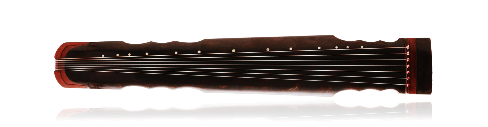 钧天坊制“大三连珠”,形制为连珠式原型,即项腰各作三个连续半月形弯入,龙池凤沼皆为方正;通体黑漆,随藏朱斑。此琴纵身修长,也是钧天坊所制有效弦长最长的“连珠式”古琴。“大三连珠”造型灵动跳跃又不失端庄典雅,观之抚之,可见范仲淹《岳阳楼记》“浮光跃金,静影沉璧”之态,动静互容,两相合宜。