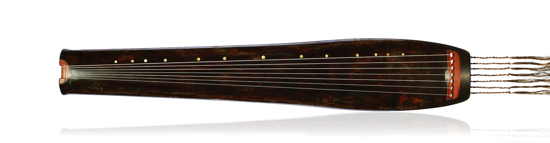 “净瓶”采用明代杉木老梁所制,髹之以黑漆,镶嵌以朱砂,容色多彩并流溢光泽;徽镶螺钿,轸悬墨玉,岳山焦尾雁足等处配以小叶紫檀;龙池凤沼皆为浑圆,出音静雅清和。抚之不仅可感甘露盈瓶之慈悲情怀,更可观照自身,体悟终极净善,正如六祖慧能之禅悟:“菩提本无树,明镜亦非台。本来无一物,何处惹尘埃。”