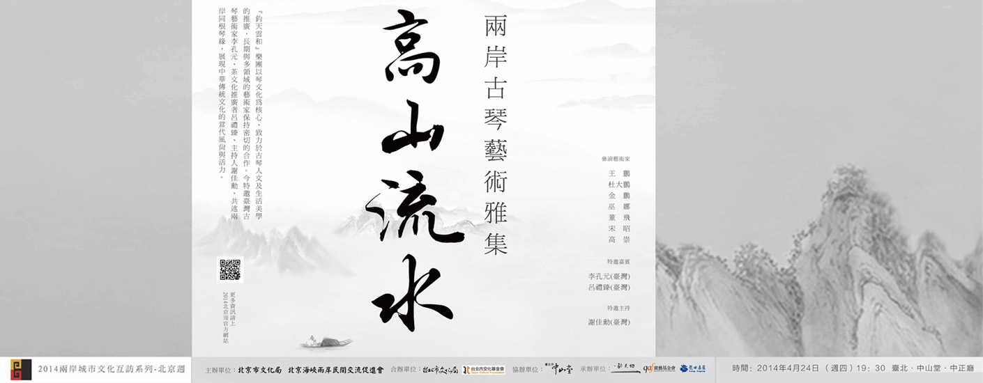 2014两岸城市文化互访系列“北京周”开幕活动——“高山流水”两岸古琴艺术雅集将于4月24日在台北市中山堂举行。本次活动由北京市文化局、北京海峡两岸民间交流促进会主办,台北市文化局、台北市文化基金会合办,台北市中山堂管理所协办,由钧天坊、台湾广益基金会、龙世嘉蓝国际传播机构共同承办。