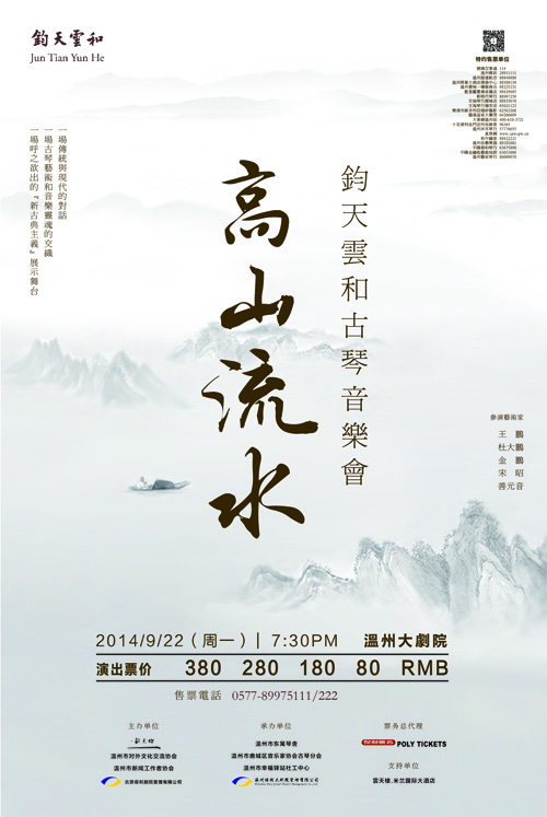 《高山流水》为中国著名古曲,不仅因其出神入化的乐曲,古来更有伯牙子期那历经千年仍感人至深的绝世知音的典故,故“高山流水”亦有“知音”的喻意。“峨峨兮若泰山……洋洋兮若江河!”君子之志,在乎“高山流水”的高远与广阔。此次“钧天云和”温州之行, 以“高山流水”为主题,意在以琴之名寻觅志同道合之知音,身先士卒为传统文化艺术于当代的演绎和传承做深入的实践与交流。