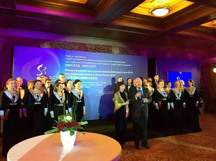 9月14日,“2015年丝绸之路国际文化论坛”于俄罗斯联邦首都莫斯科总统大酒店开幕。开幕式由中国丝绸之路基金会秘书长张杏兰女士和普京总统特使、独联体国际人文交流合作基金会联合主席米哈伊尔.什维徳科伊主持。俄罗斯联邦副总理奥丽加.戈洛杰茨和中华人民共和国驻俄联邦全权大使李辉等各国政要分别致辞。
