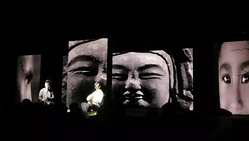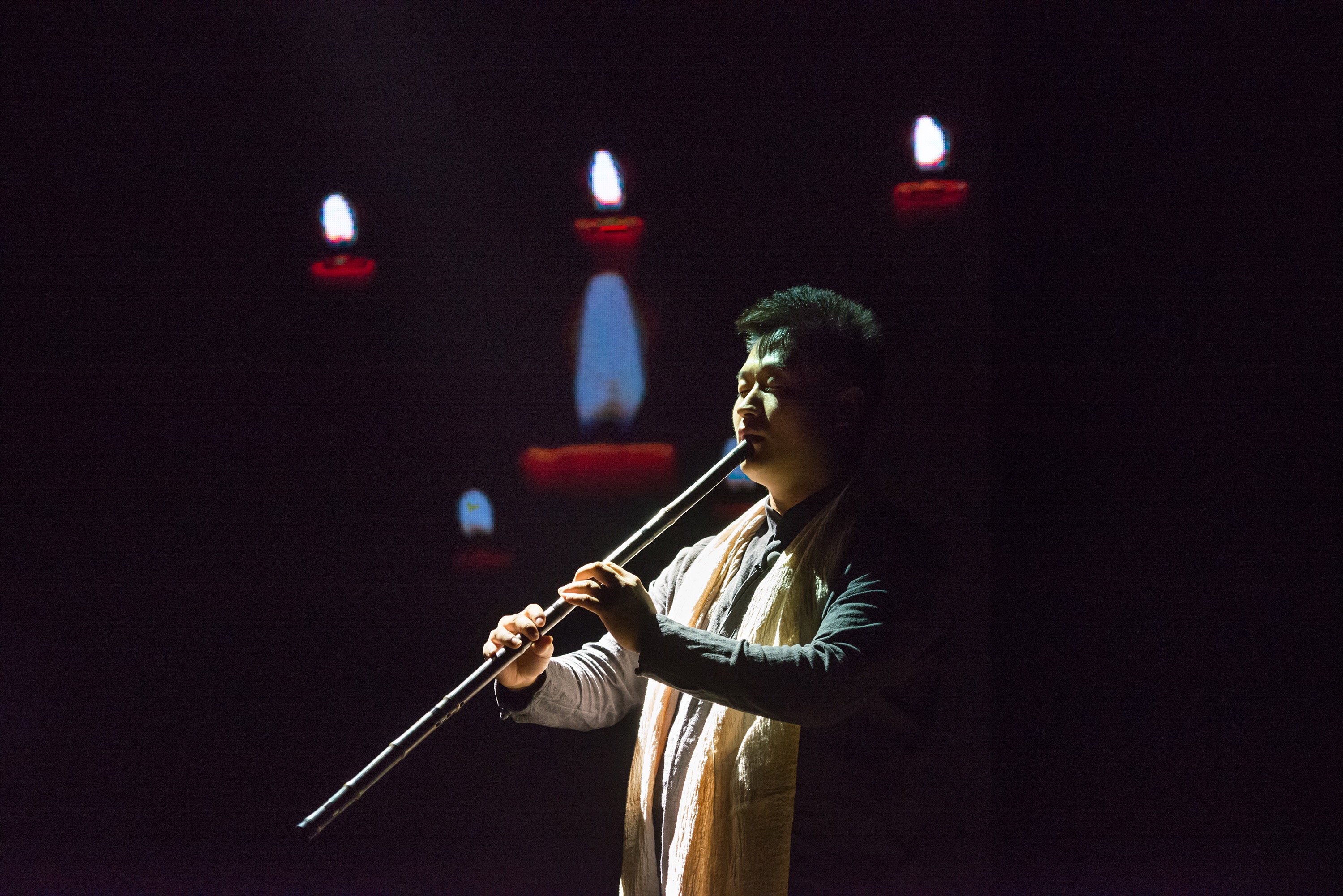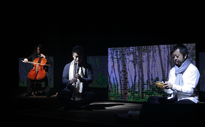 及至全场黑暗,随着一声声清脆如铃音般的音乐,之前怀抱吉他的歌者手握拇指琴营造空灵,再次与箫、大提琴相呼应,时而低吟,时而高亢,让人的身体跟随着音乐情绪而穿行,而放空。
