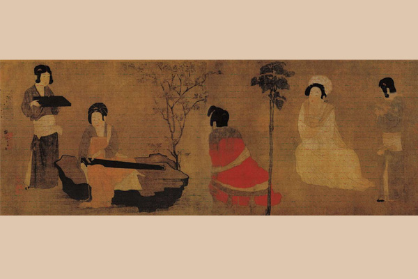 此图又名《弹琴仕女图》,画三位坐在庭院里的贵妇在两个女仆的伺候下弹琴、品茶、听乐,表现了贵族妇女闲散恬静的享乐生活。图中绘有桂花树和梧桐树,寓意秋日已至。贵妇们似乎已预感到花季过后面临的将是凋零。调琴和啜茗的妇人肩上的披纱滑落下来,显示出她们慵懒寂寞和睡意惺忪的颓唐之态。